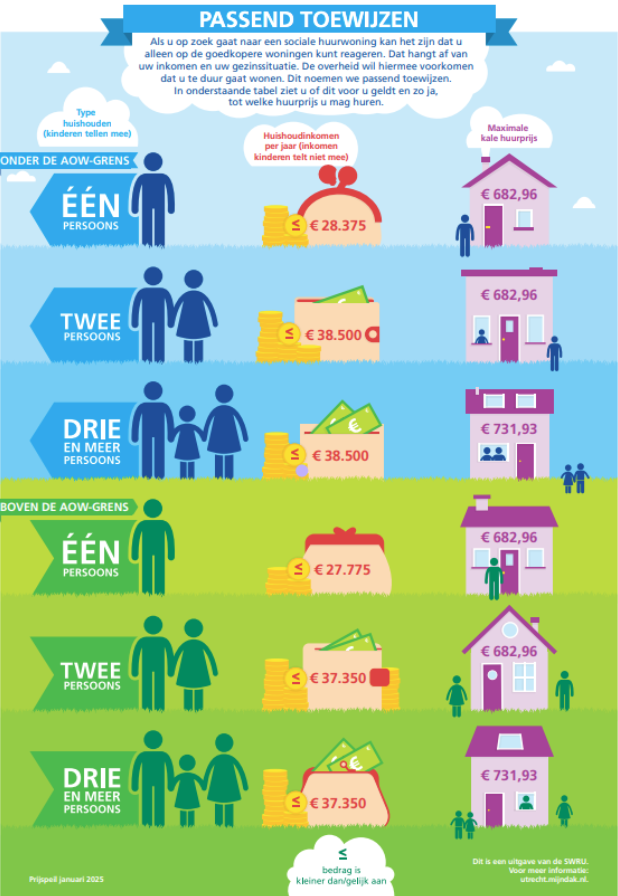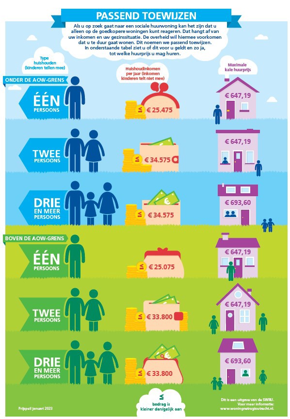 Sinds1 januari 2016 zijn wij wettelijk verplicht om woningen passend toe te wijzen. Dat betekent dat wij al onze sociale huurwoningen moeten verhuren aan woningzoekenden met een inkomen dat volgens de wet 'past' bij de huurprijs. Zo voorkomen we dat mensen met de laagste inkomens in te dure huurwoningen gaan wonen.
